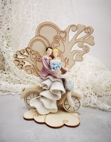 Poročni par-bicikel iz umetne mase dopolnjuje lesen podstavek drevo življenja, velikosti 14 cm.